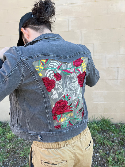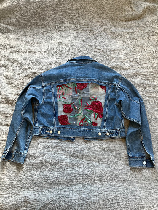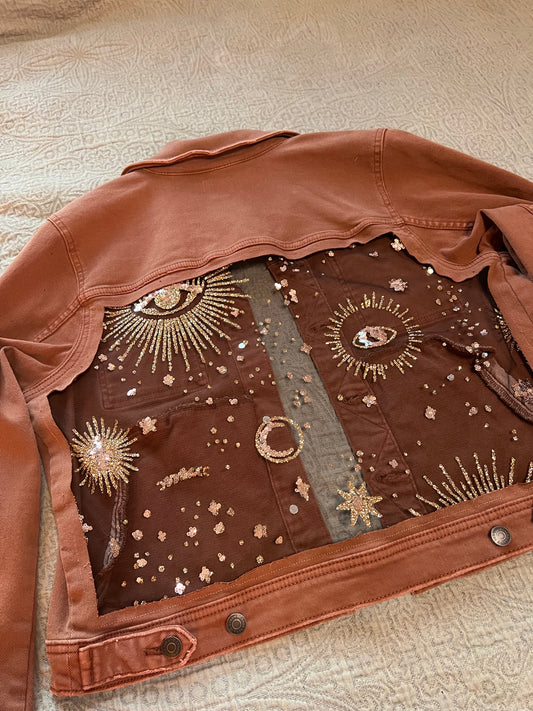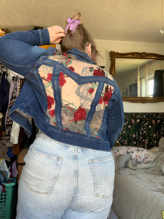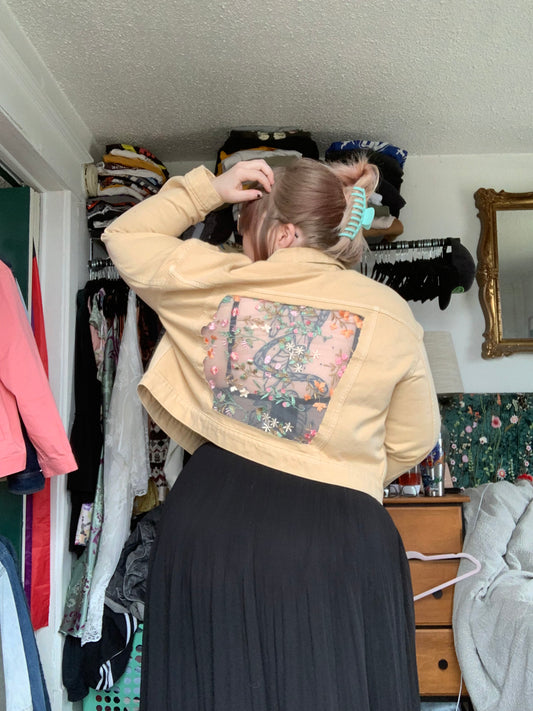 I have tons of different embroidered, printed, sequined and all around rad tulles that are each chosen specifically for the jacket they are in. 1of1 unique pieces that only you have 💖 Each panel is specifically chosen for the jacket as well making your personal art gallery layout completely unique to you!