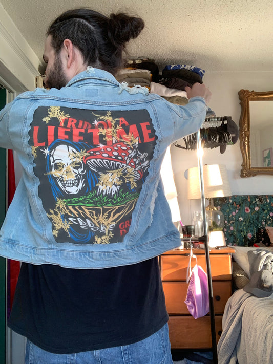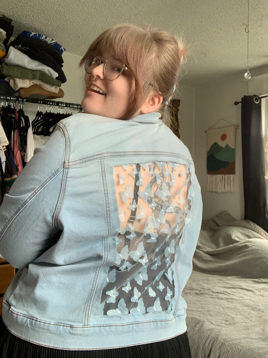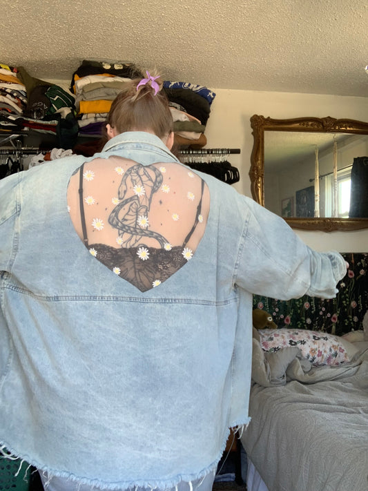 I have tons of different embroidered, printed, sequined and all around rad tulles that are each chosen specifically for the jacket they are in. 1of1 unique pieces that only you have π Each panel is specifically chosen for the jacket as well making your personal art gallery layout completely unique to you!