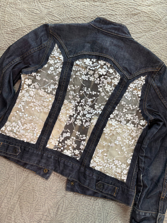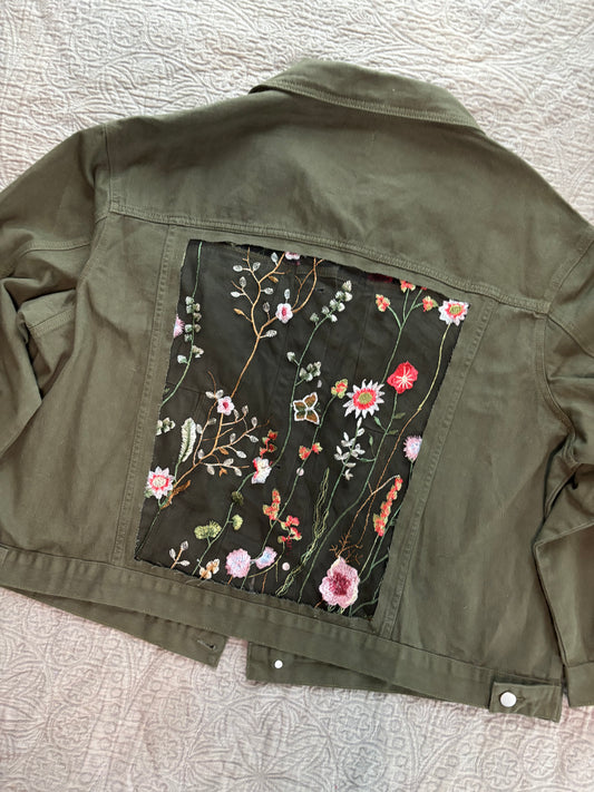 I have tons of different embroidered, printed, sequined and all around rad tulles that are each chosen specifically for the jacket they are in. 1of1 unique pieces that only you have π Each panel is specifically chosen for the jacket as well making your personal art gallery layout completely unique to you!