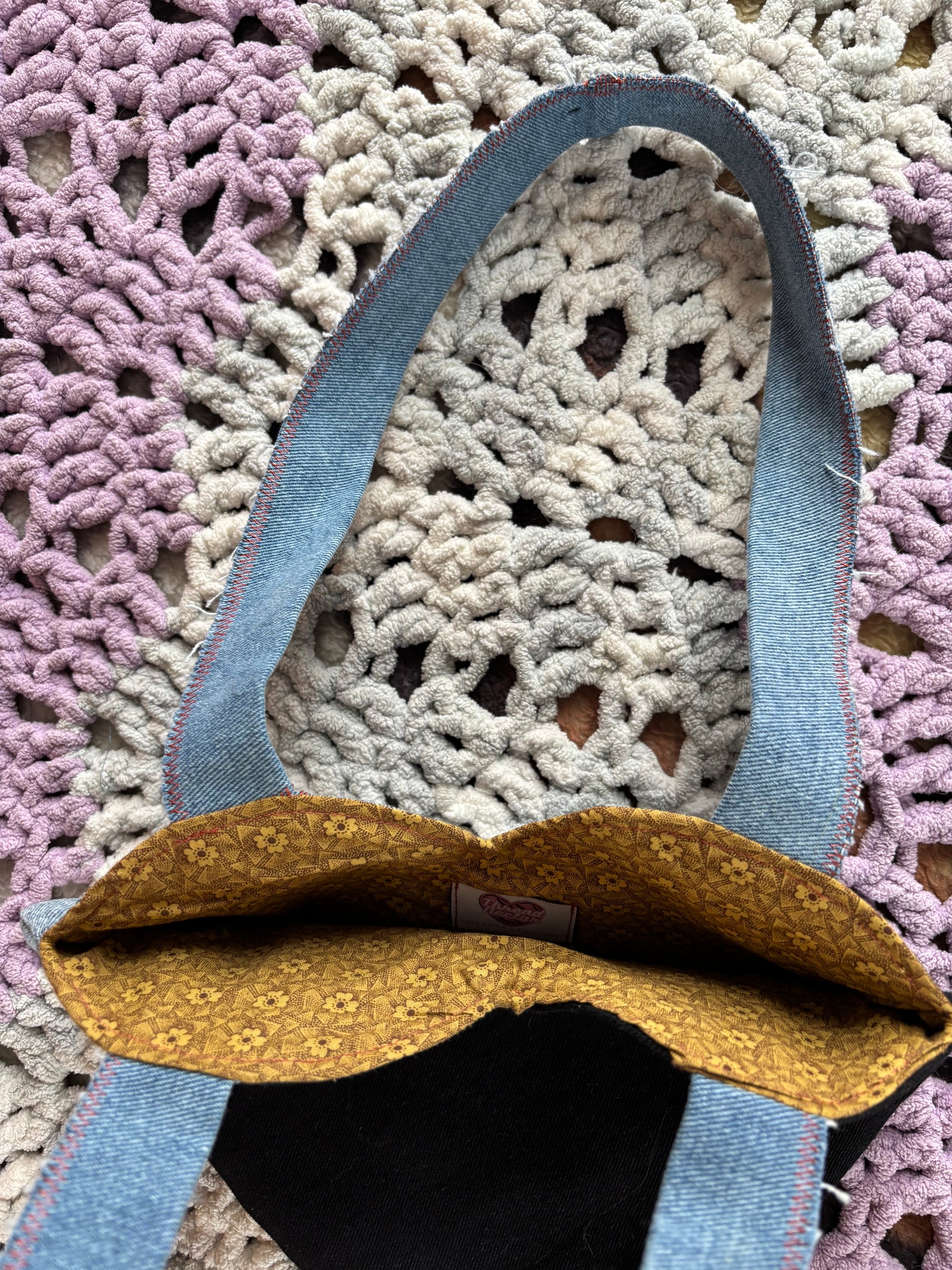 Black and Light wash denim patchworked together and lined with a burnt orange floral cotton lining with a matching scrap denim handle.