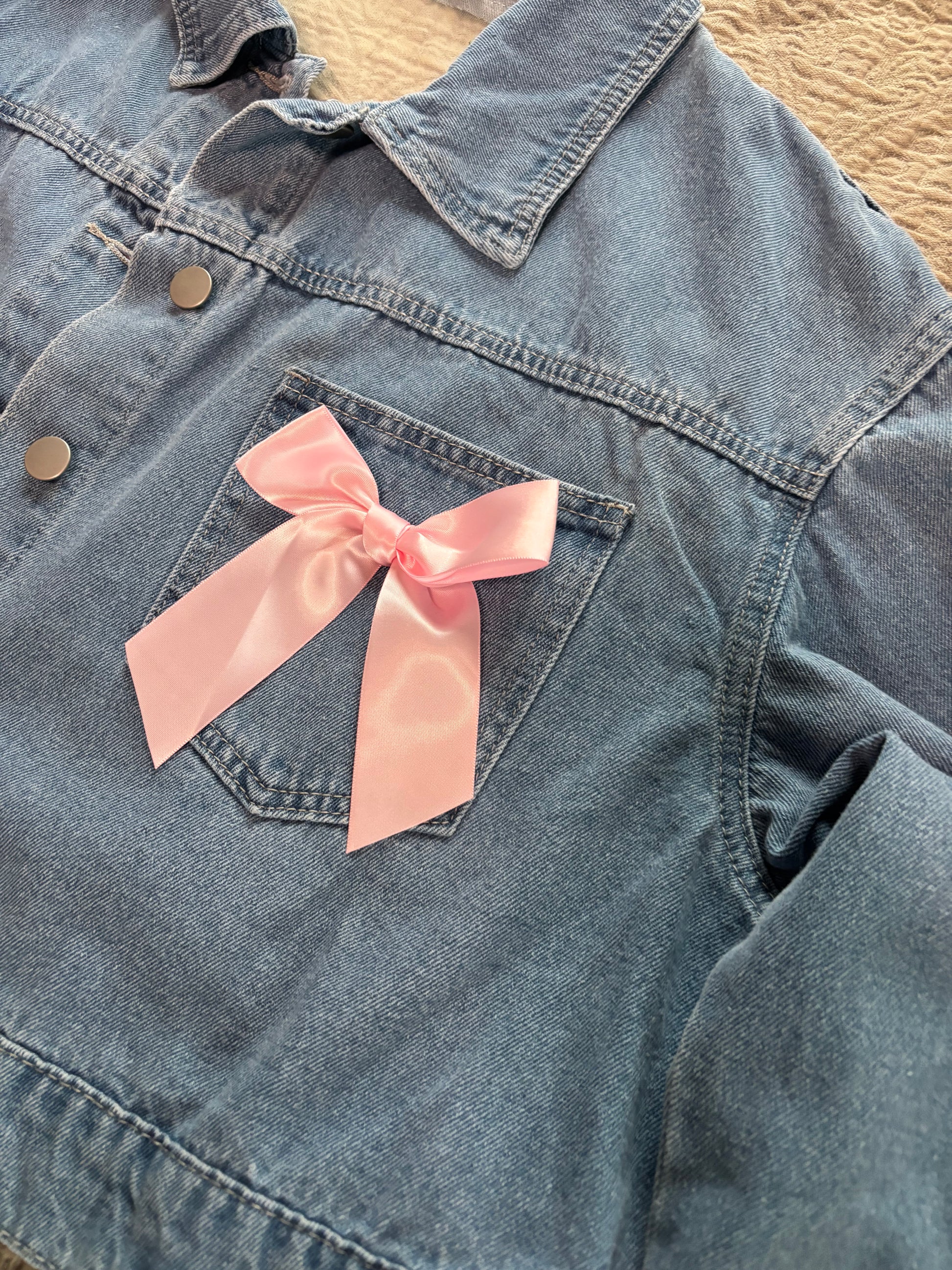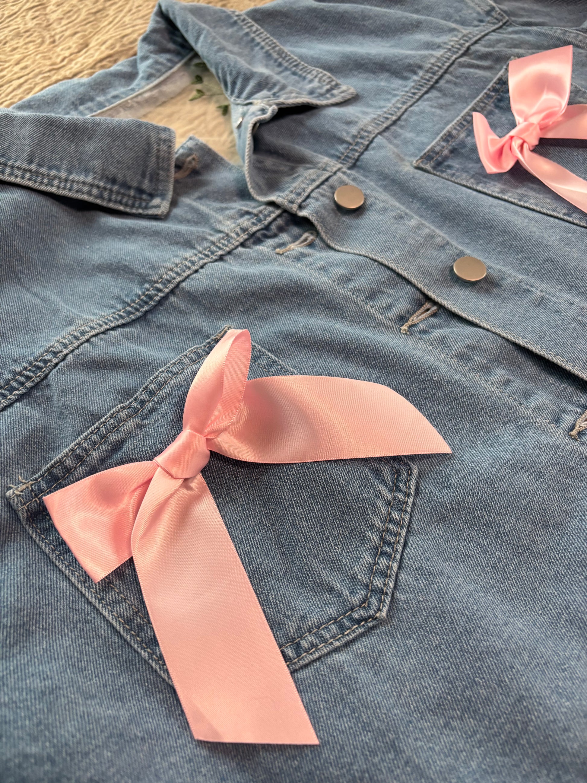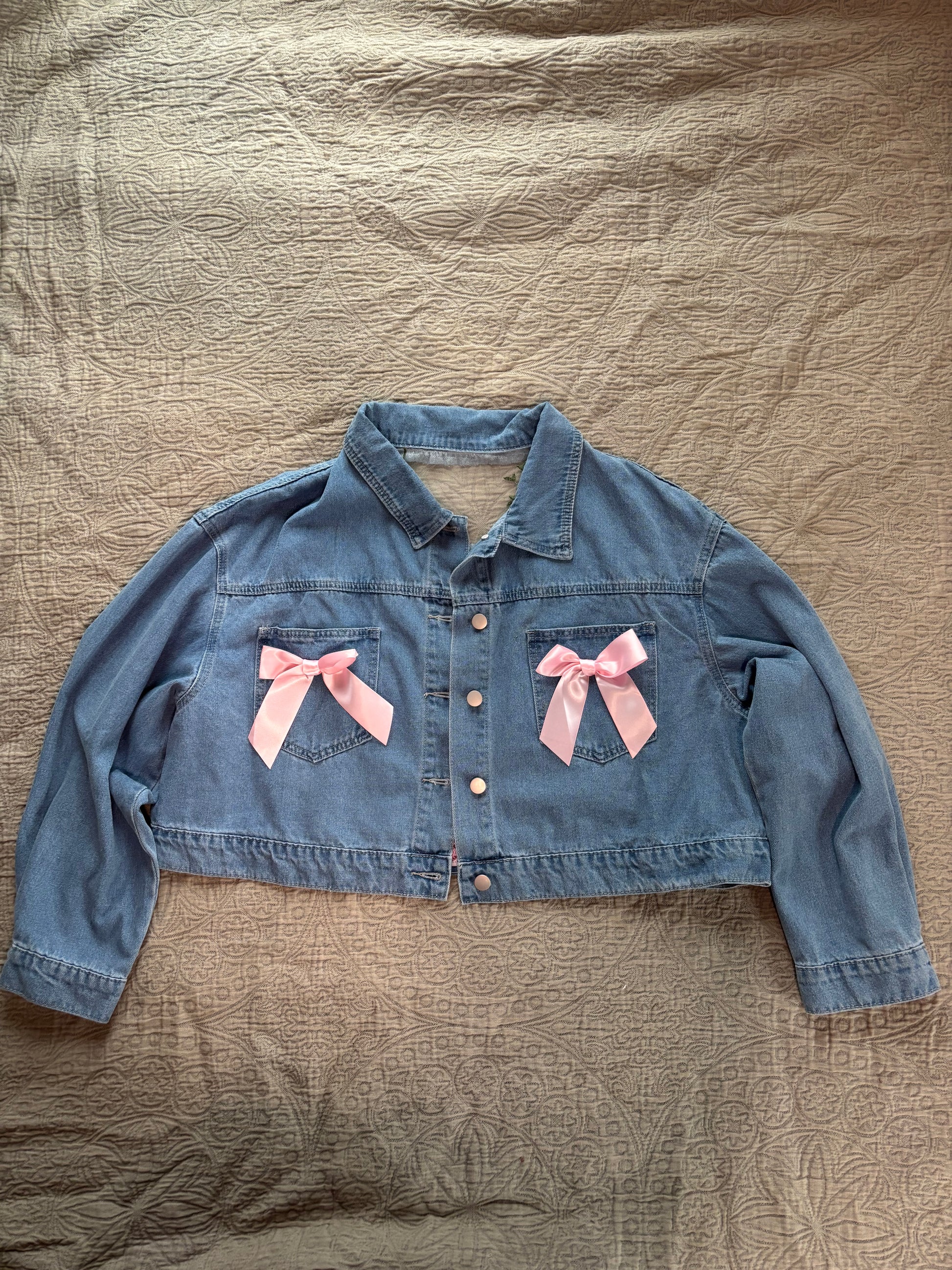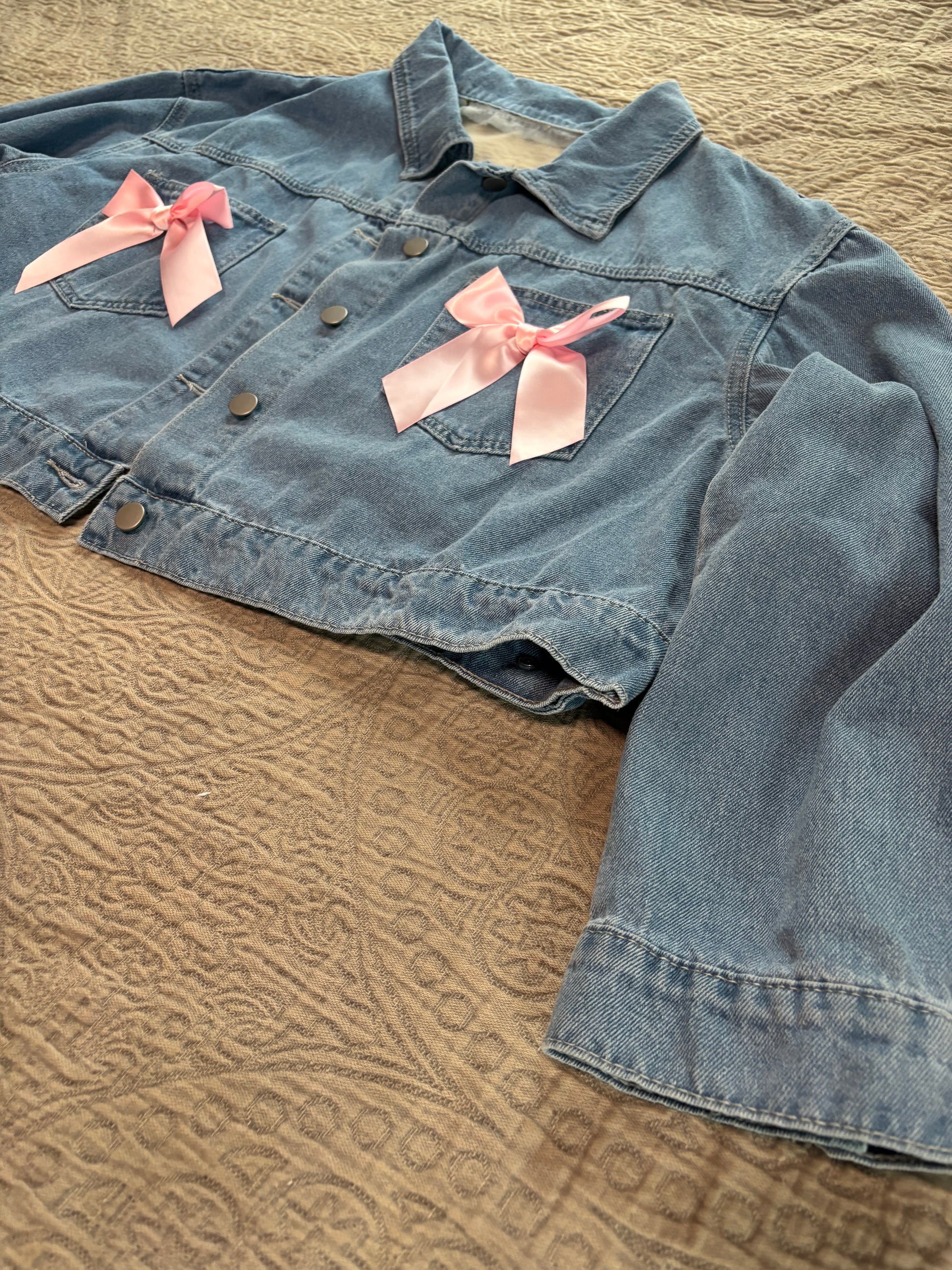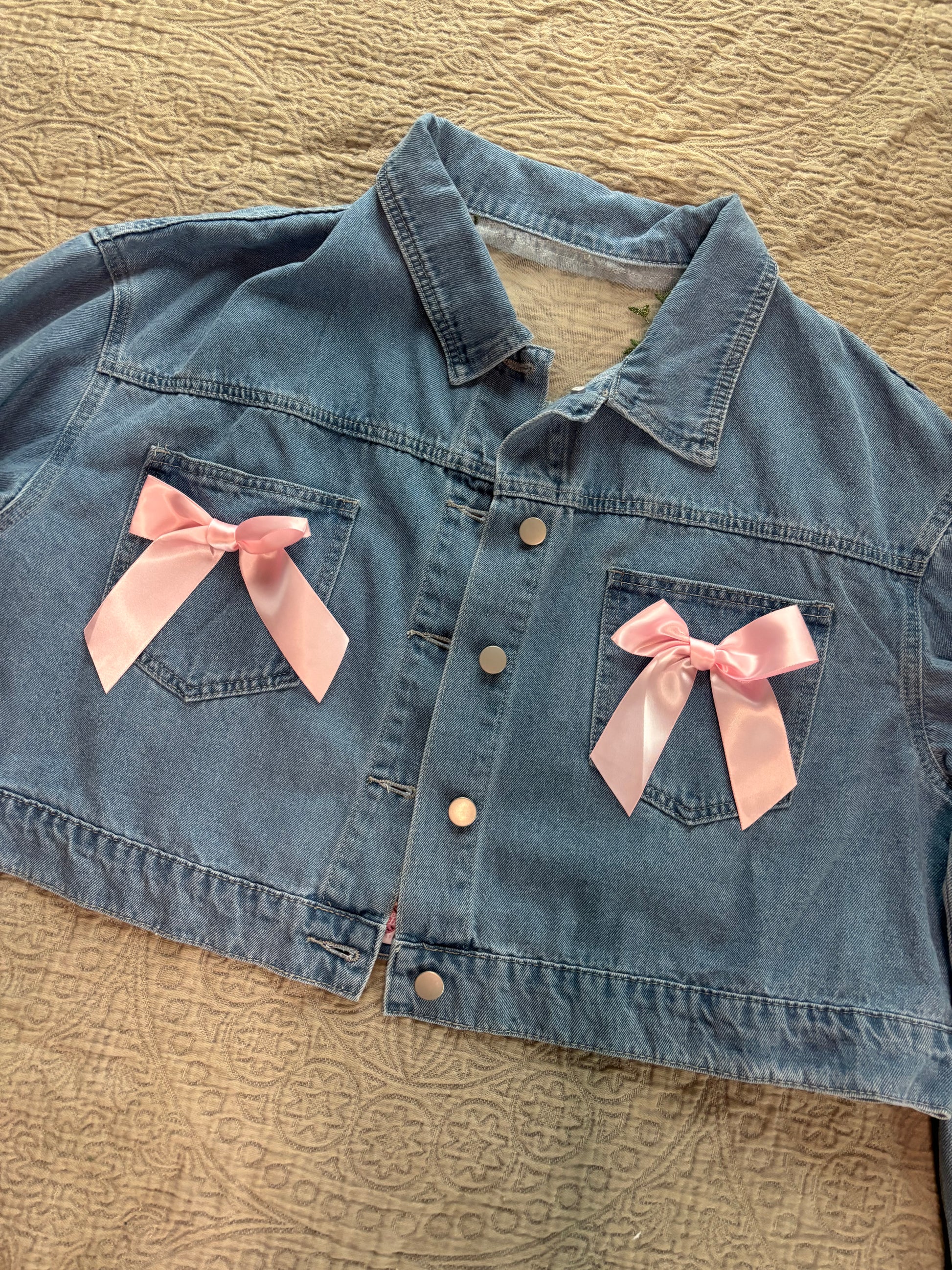 Cropped Denim Pink Floral Jacket with Bows [3X]