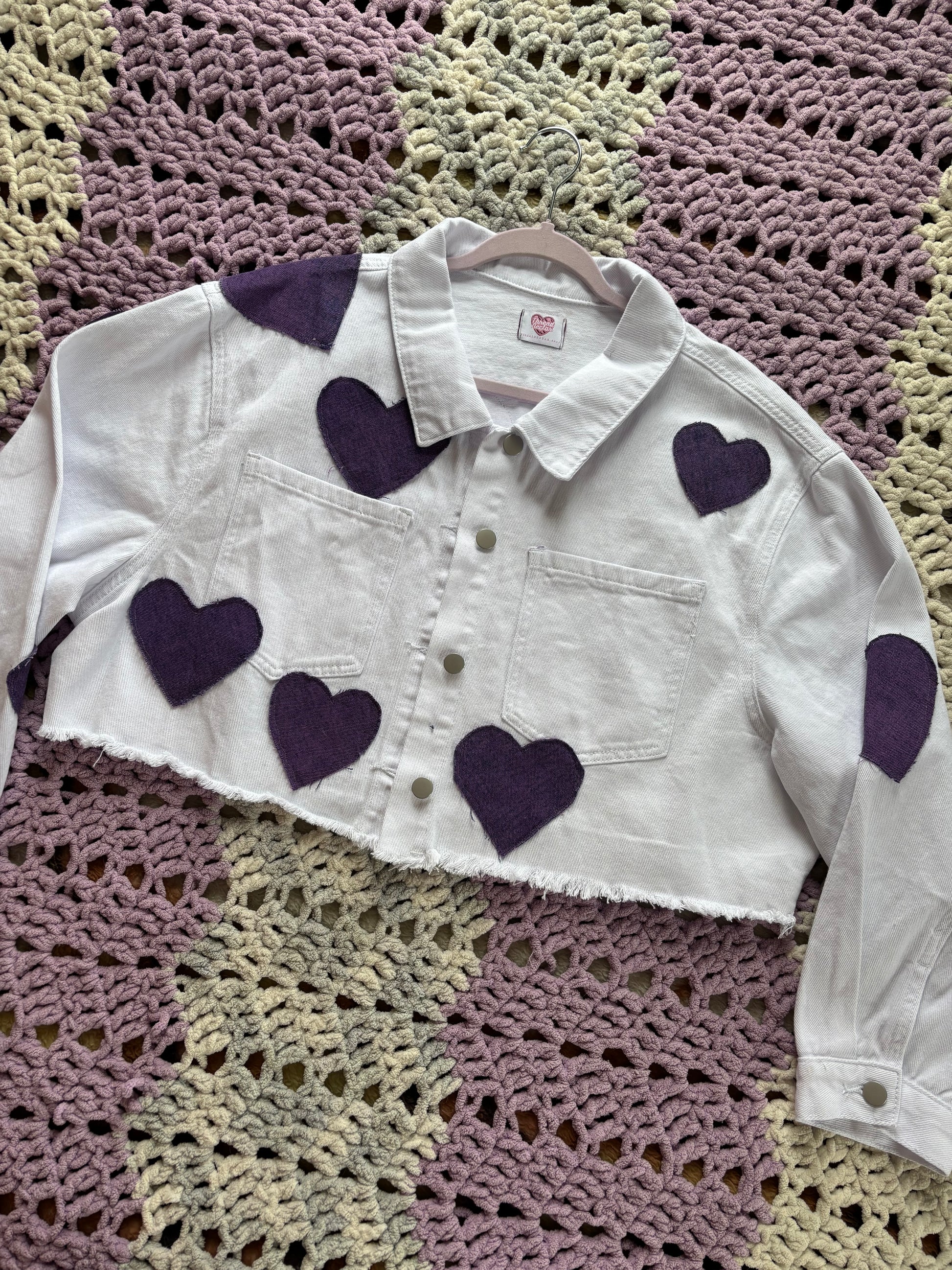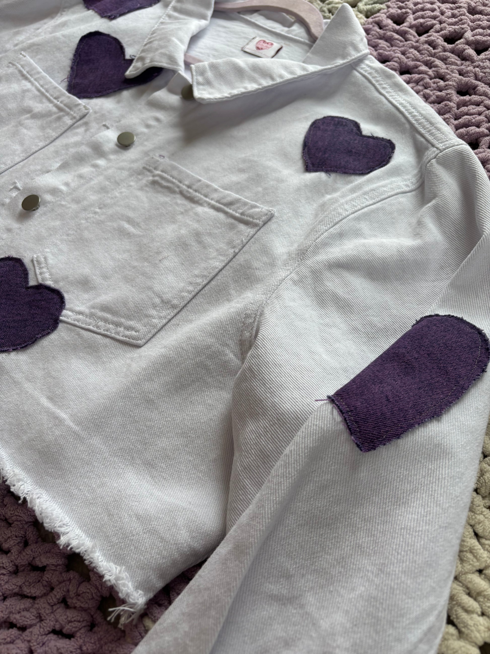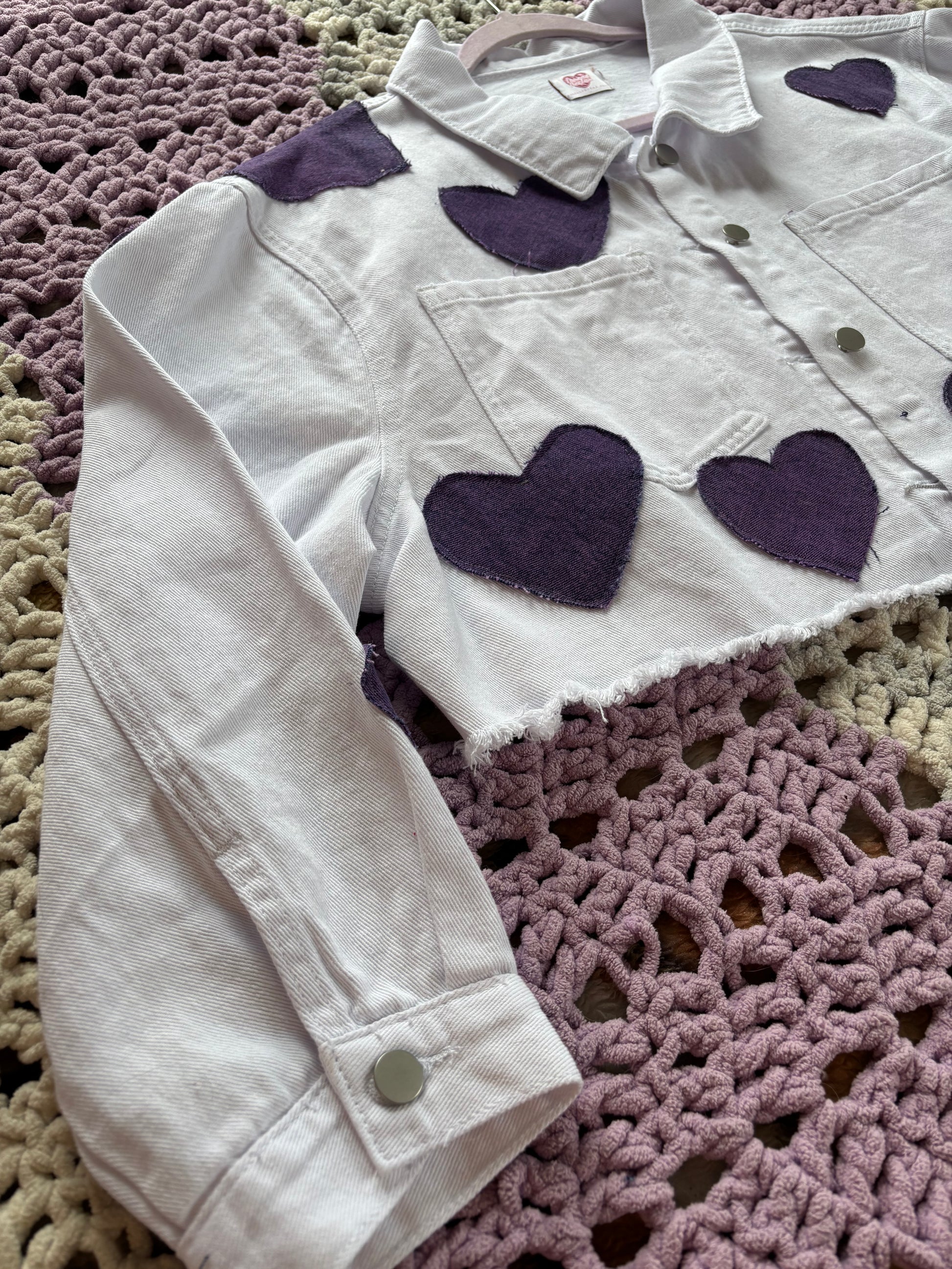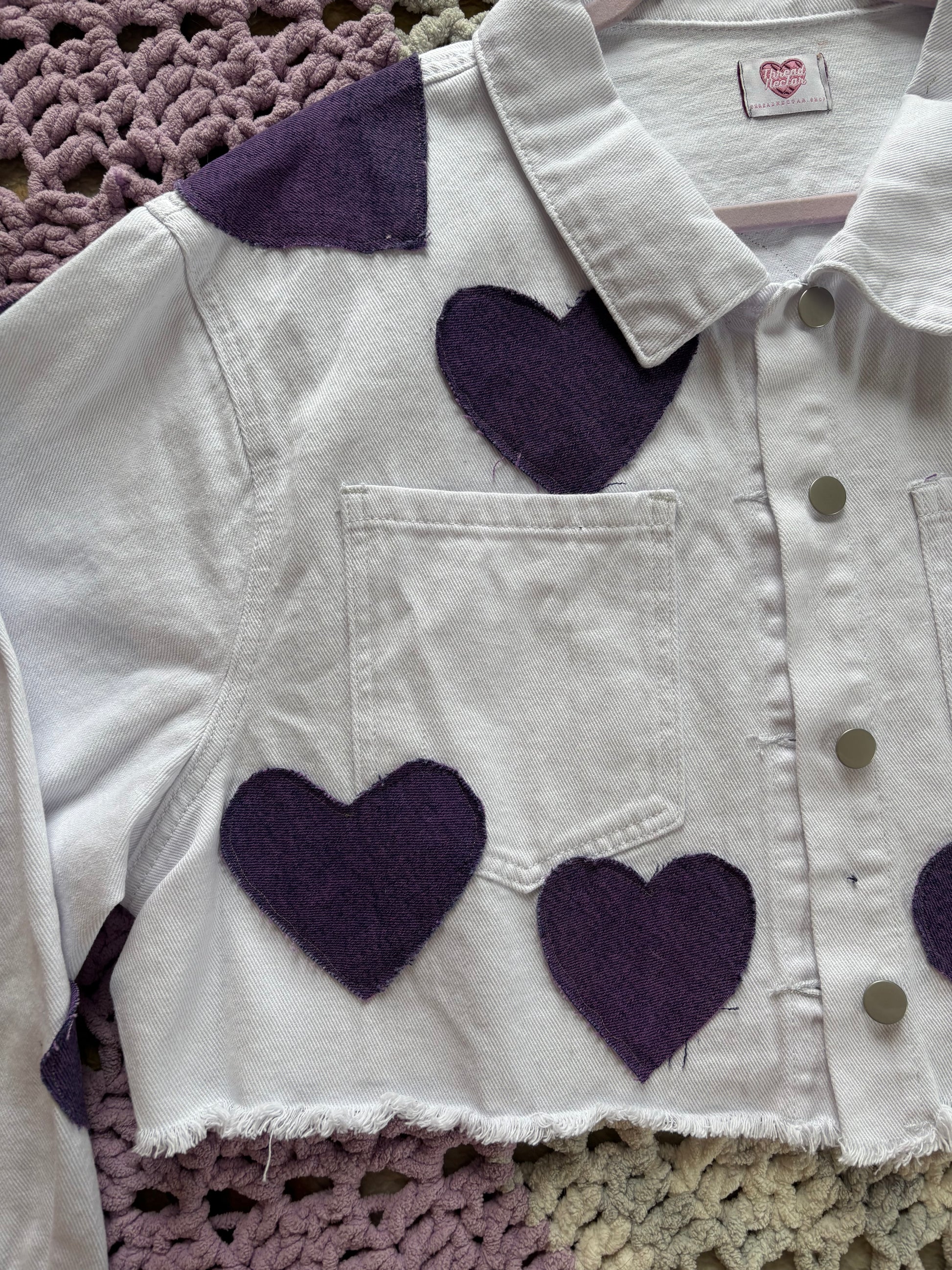 Cropped White Denim Frayed Purple Hearts Jacket [3X]