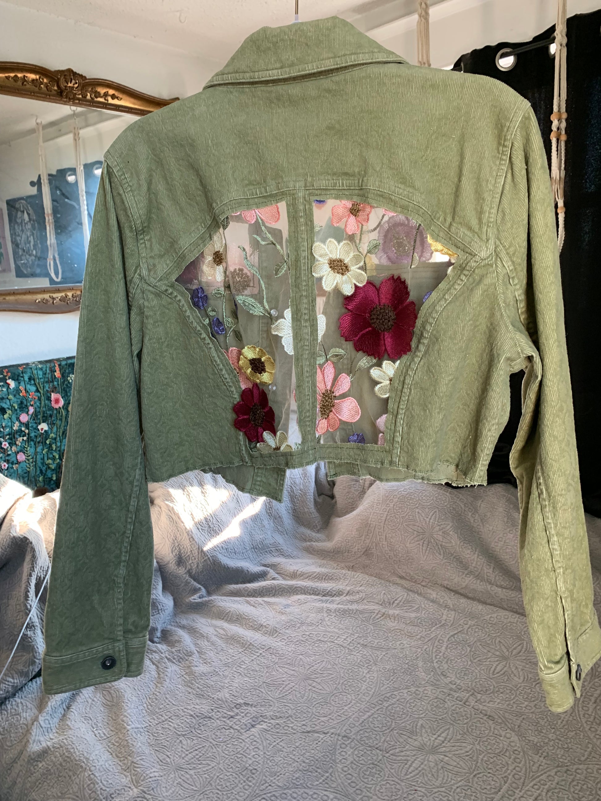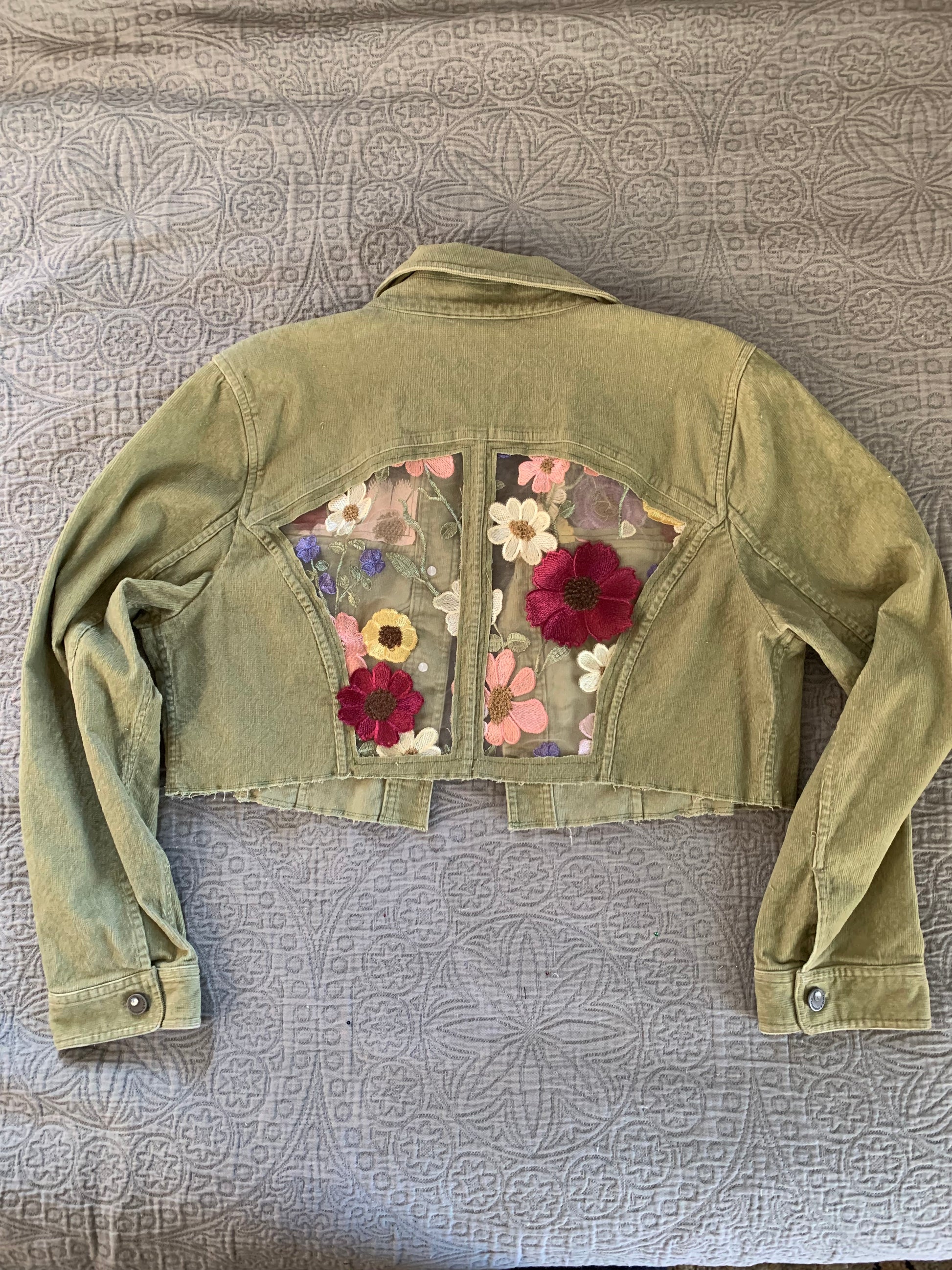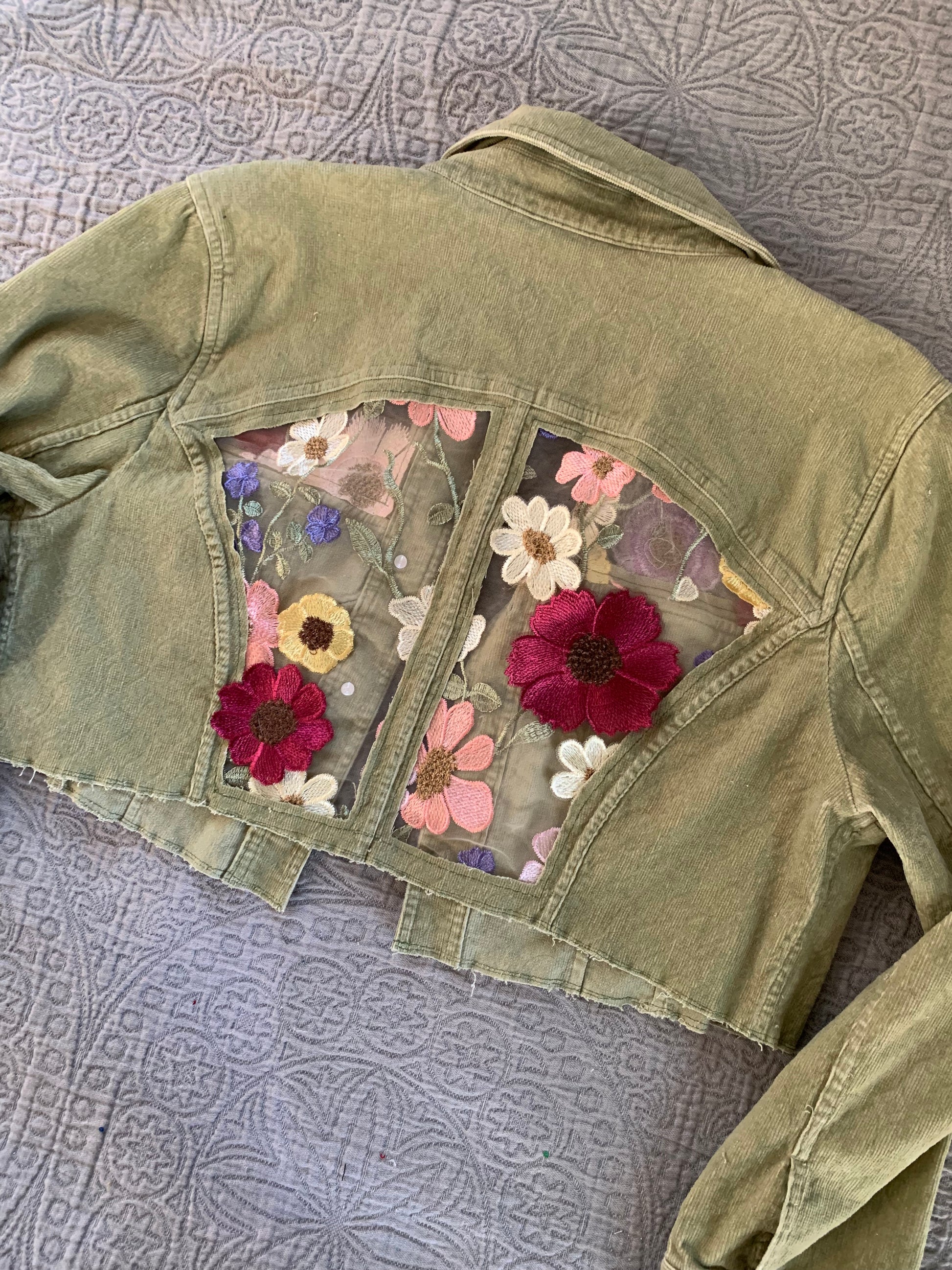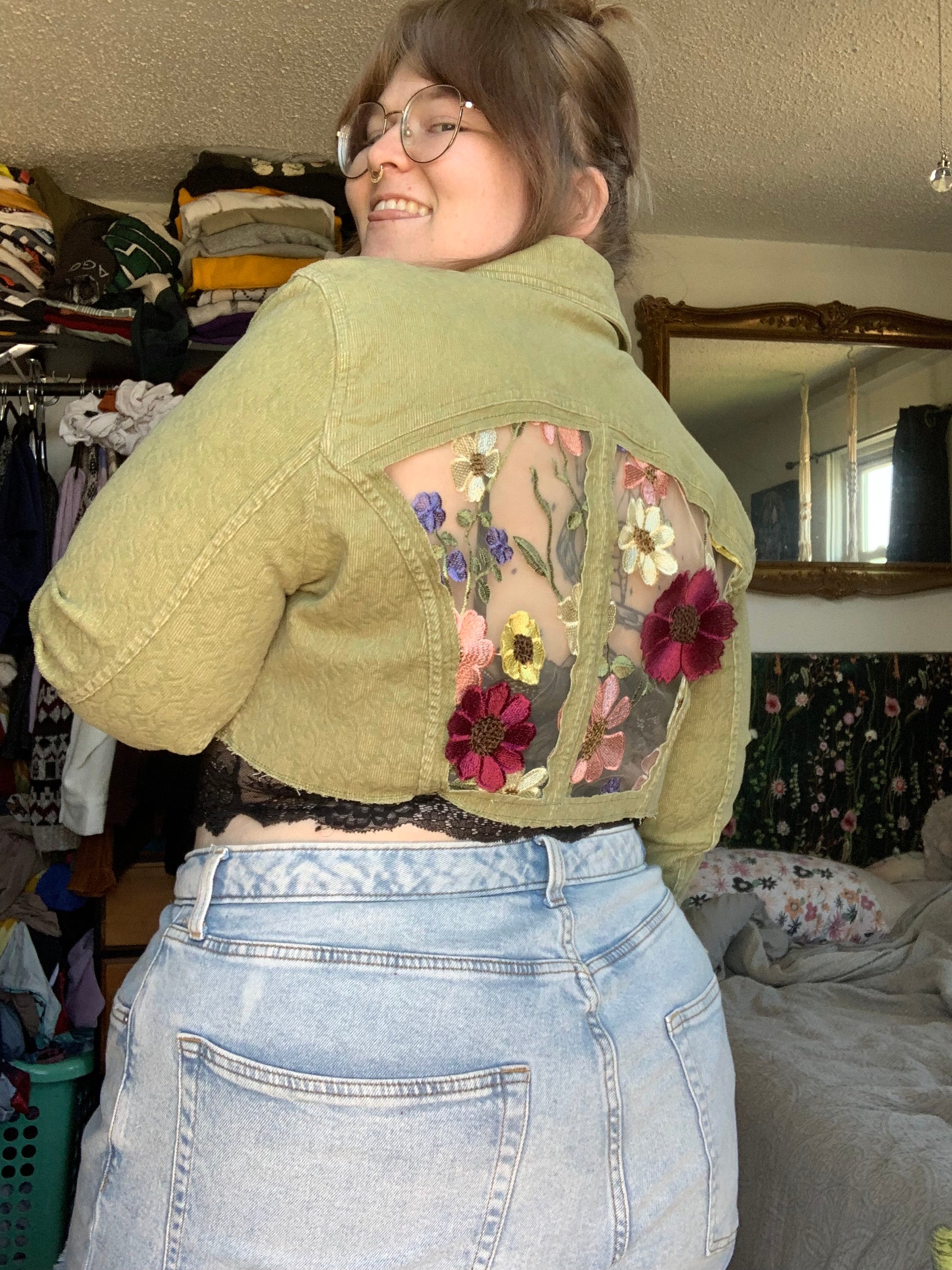 Cropped Green Denim Appliqué Wildflowers [XL]