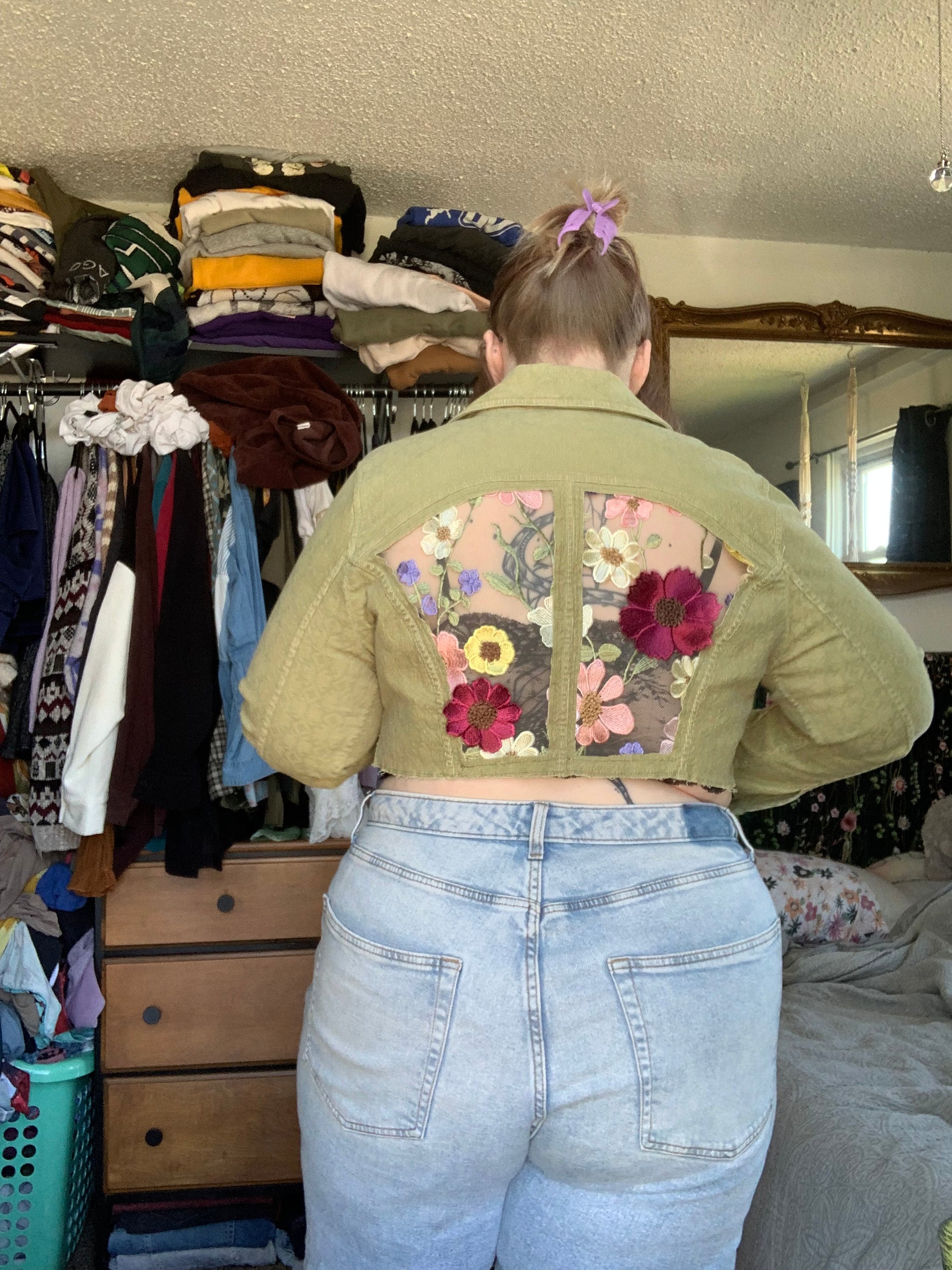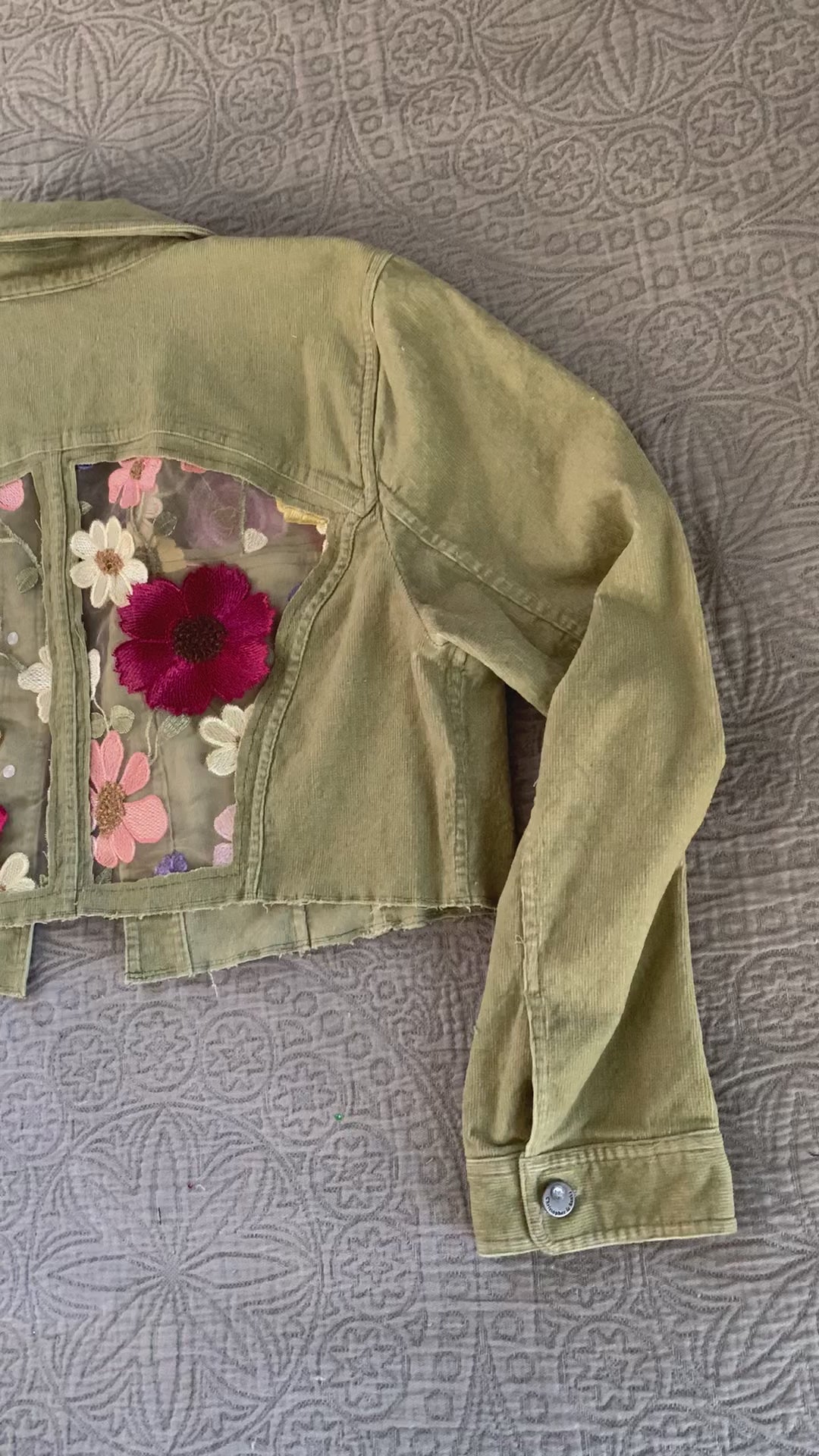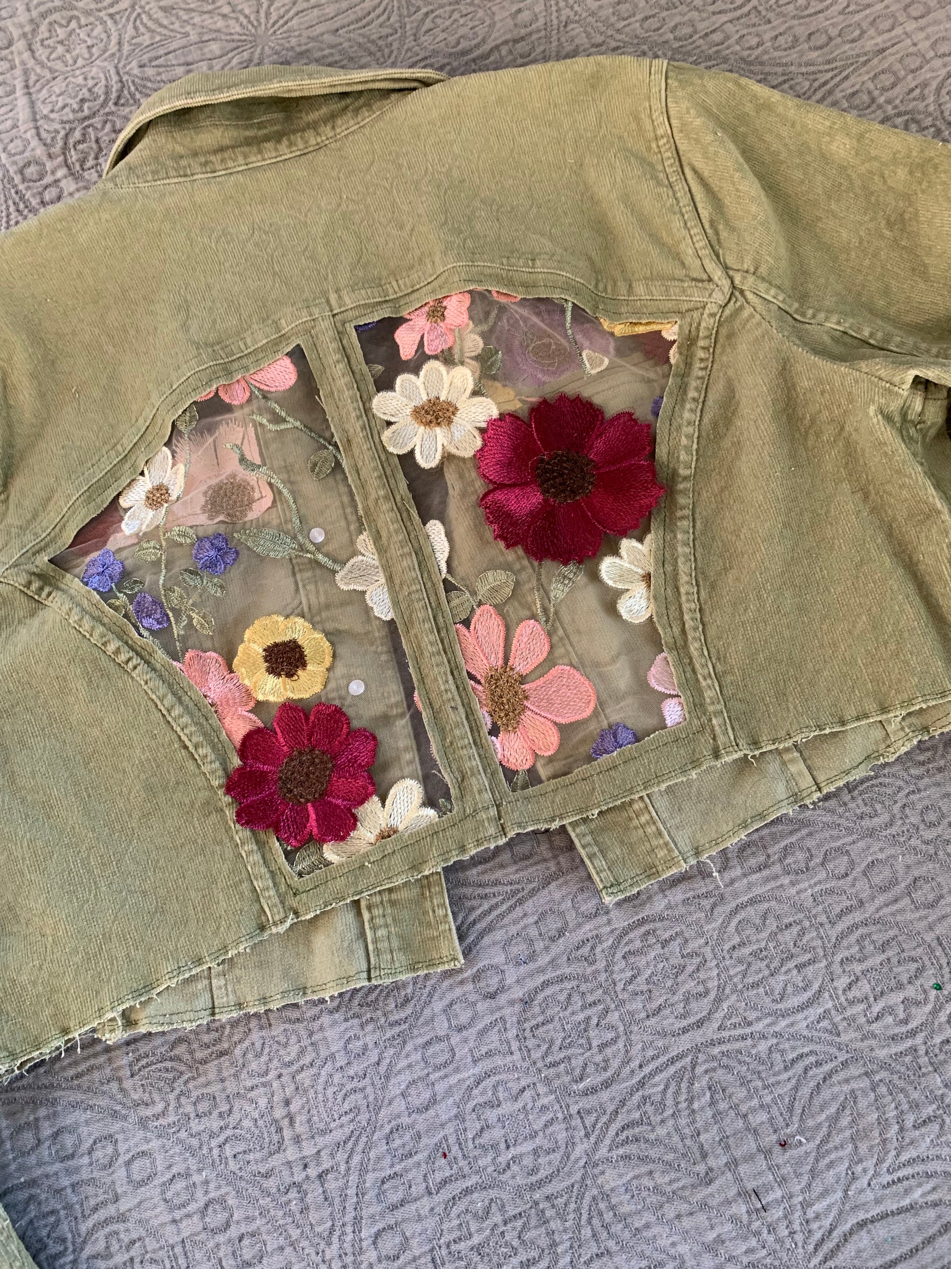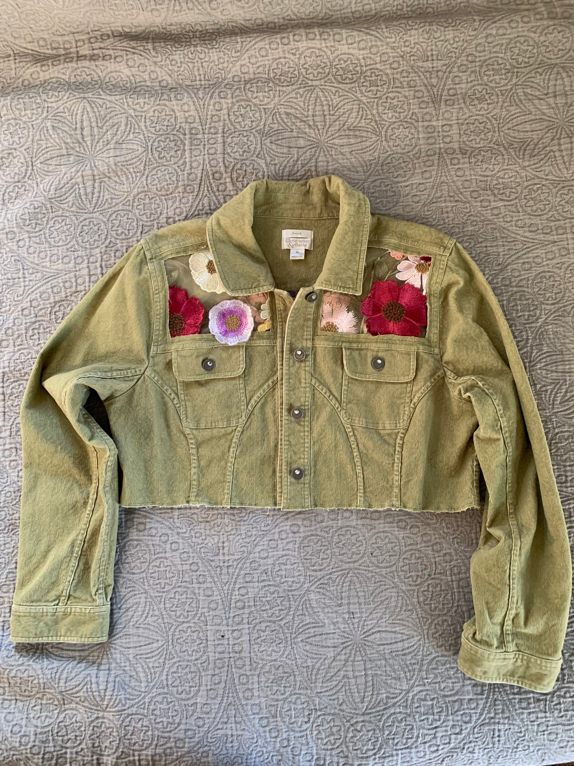 Cropped Green Denim Appliqué Wildflowers [XL]