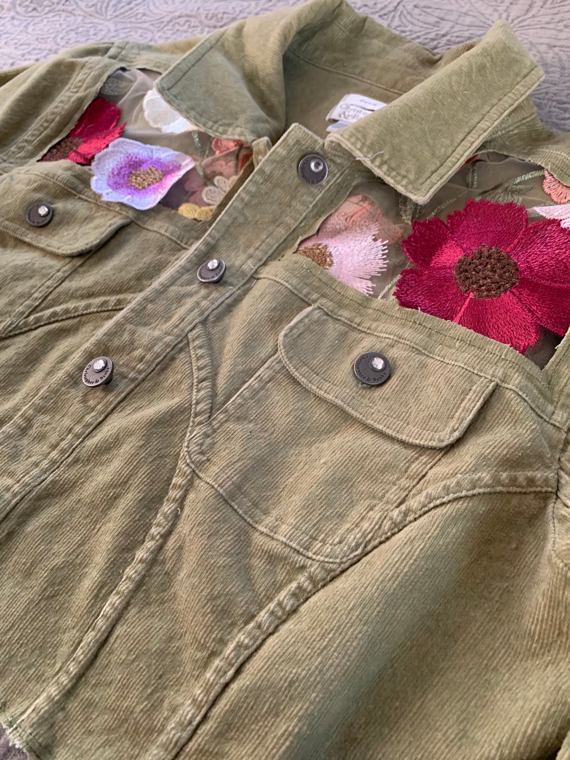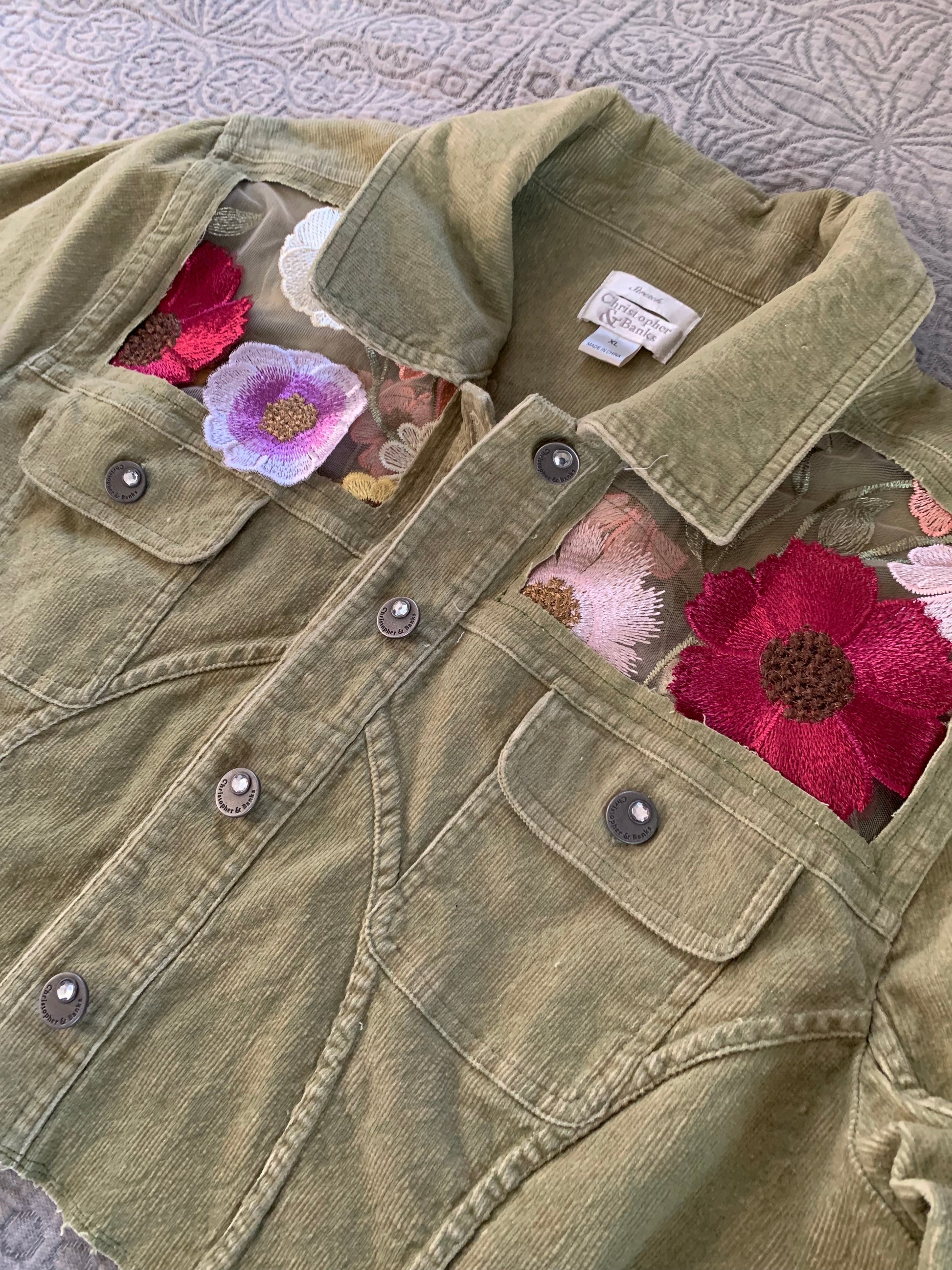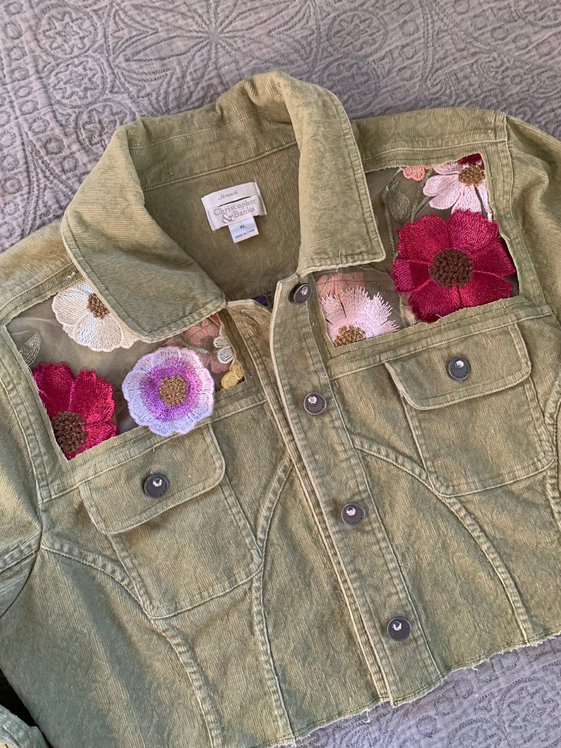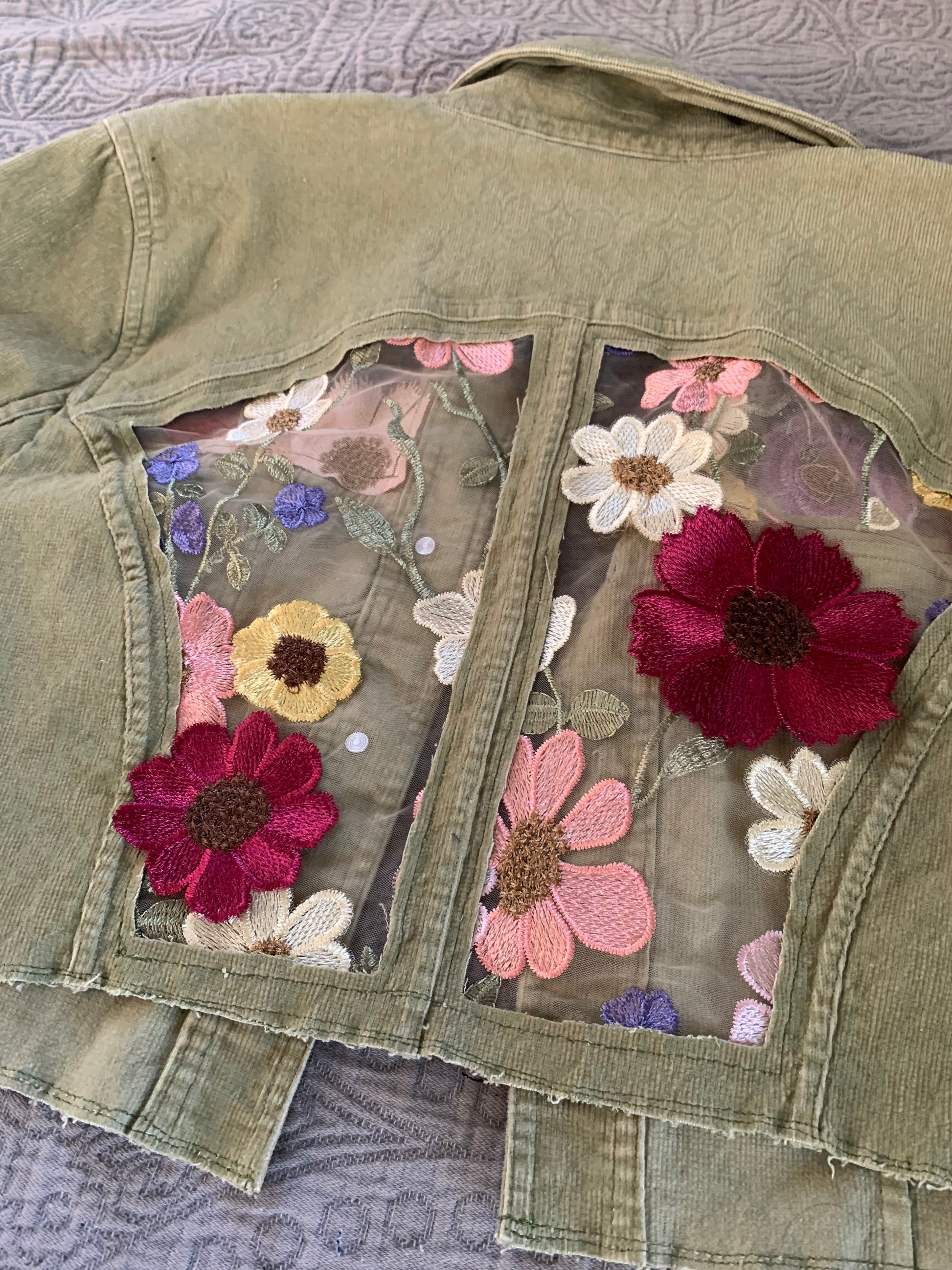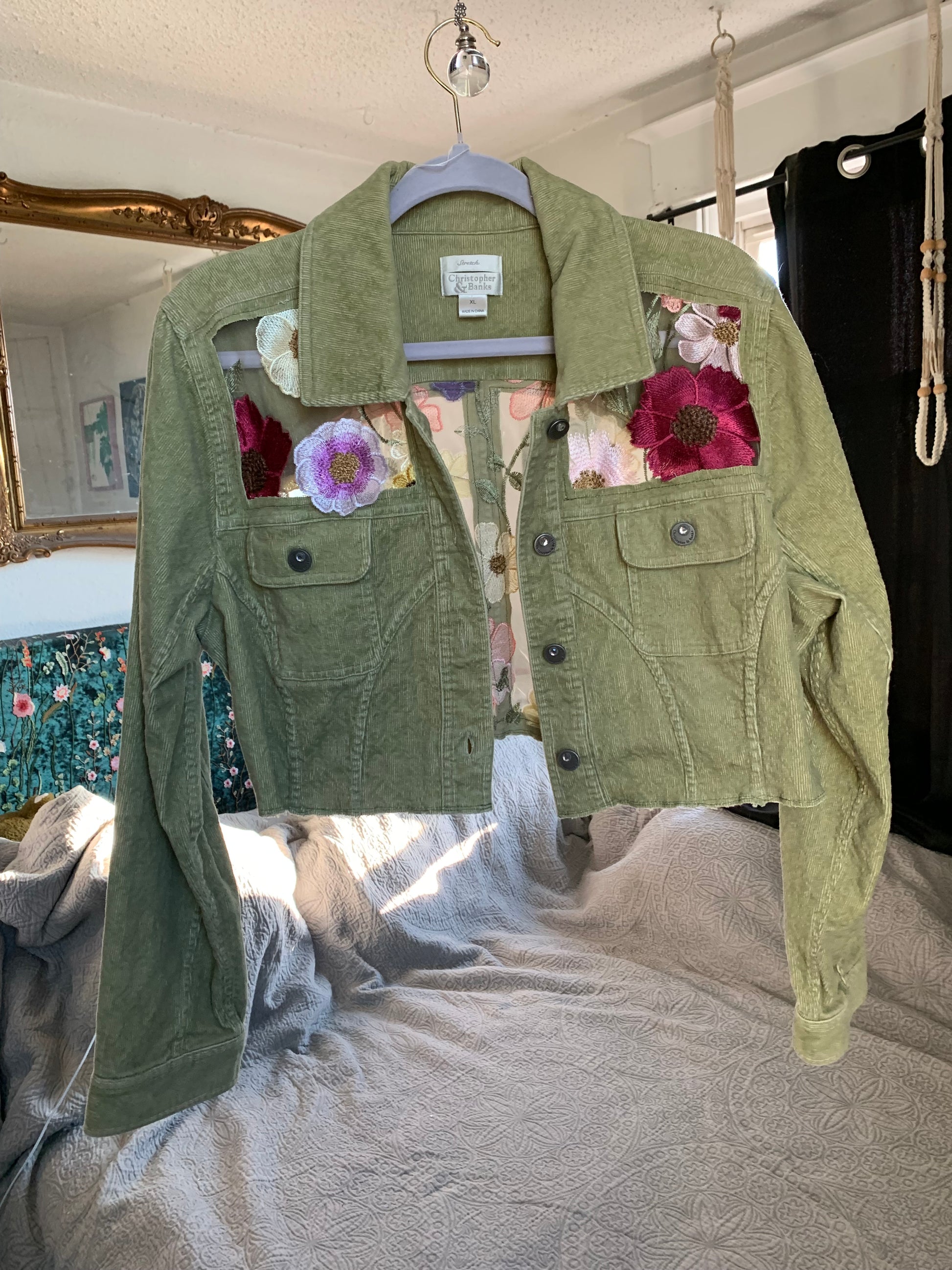 Cropped Green Denim Appliqué Wildflowers [XL]