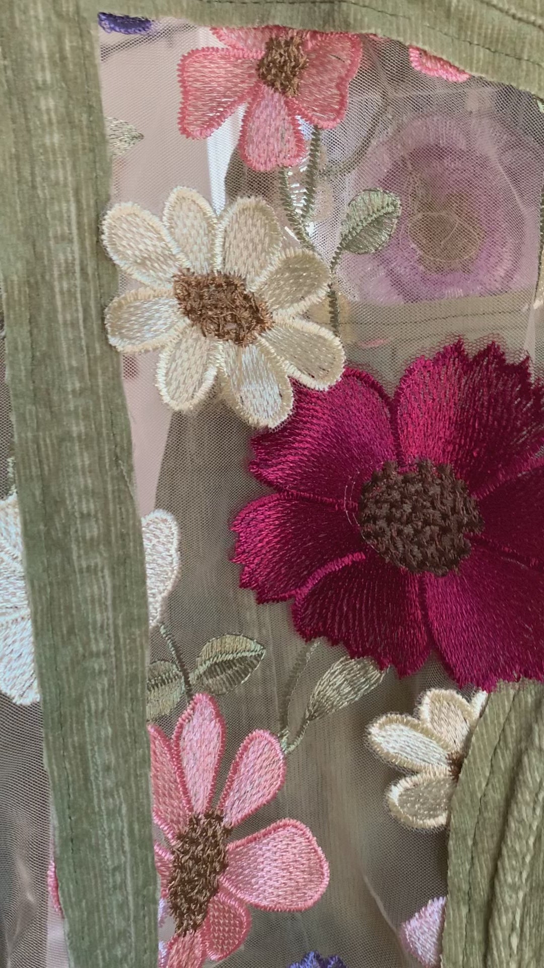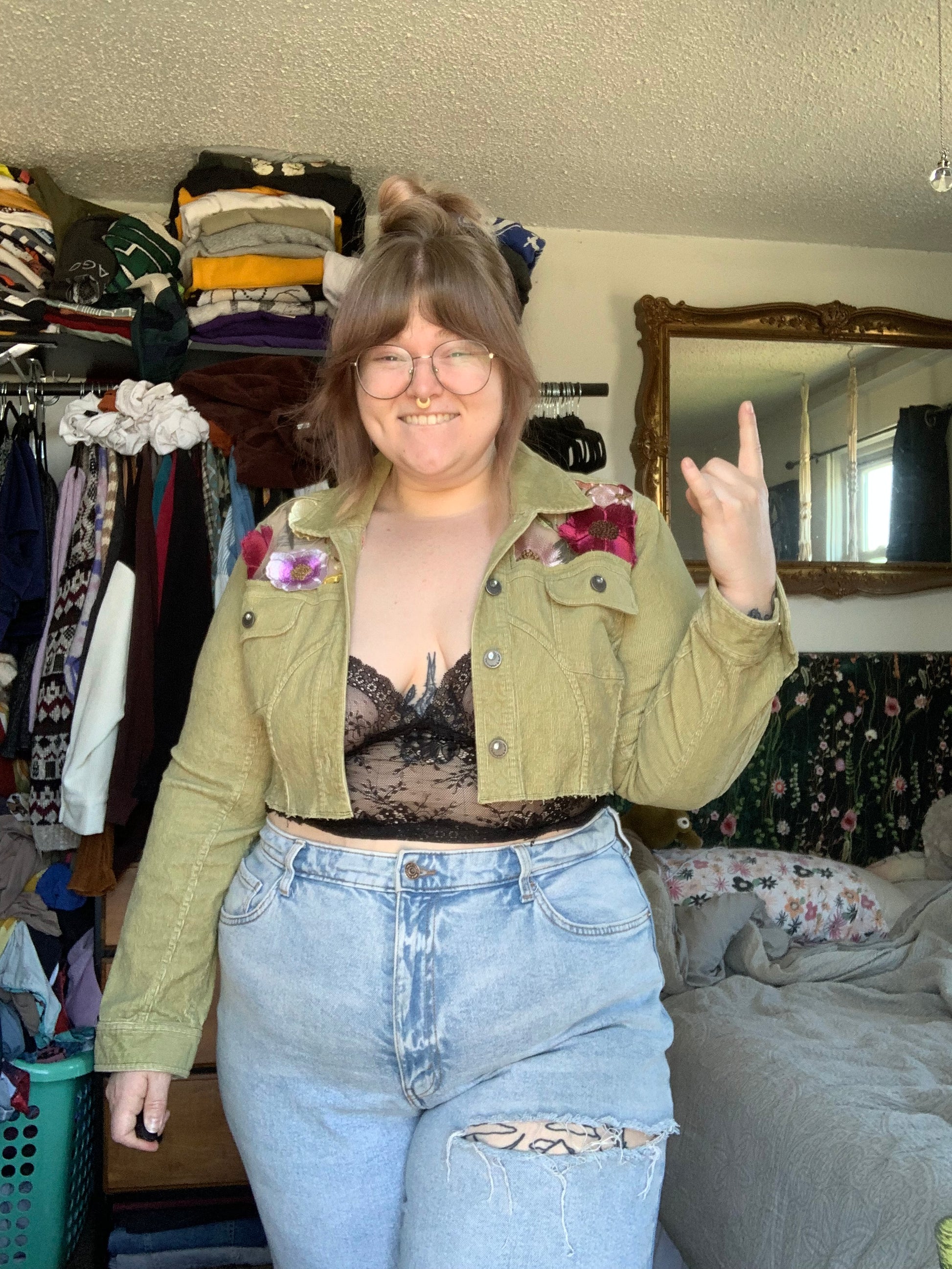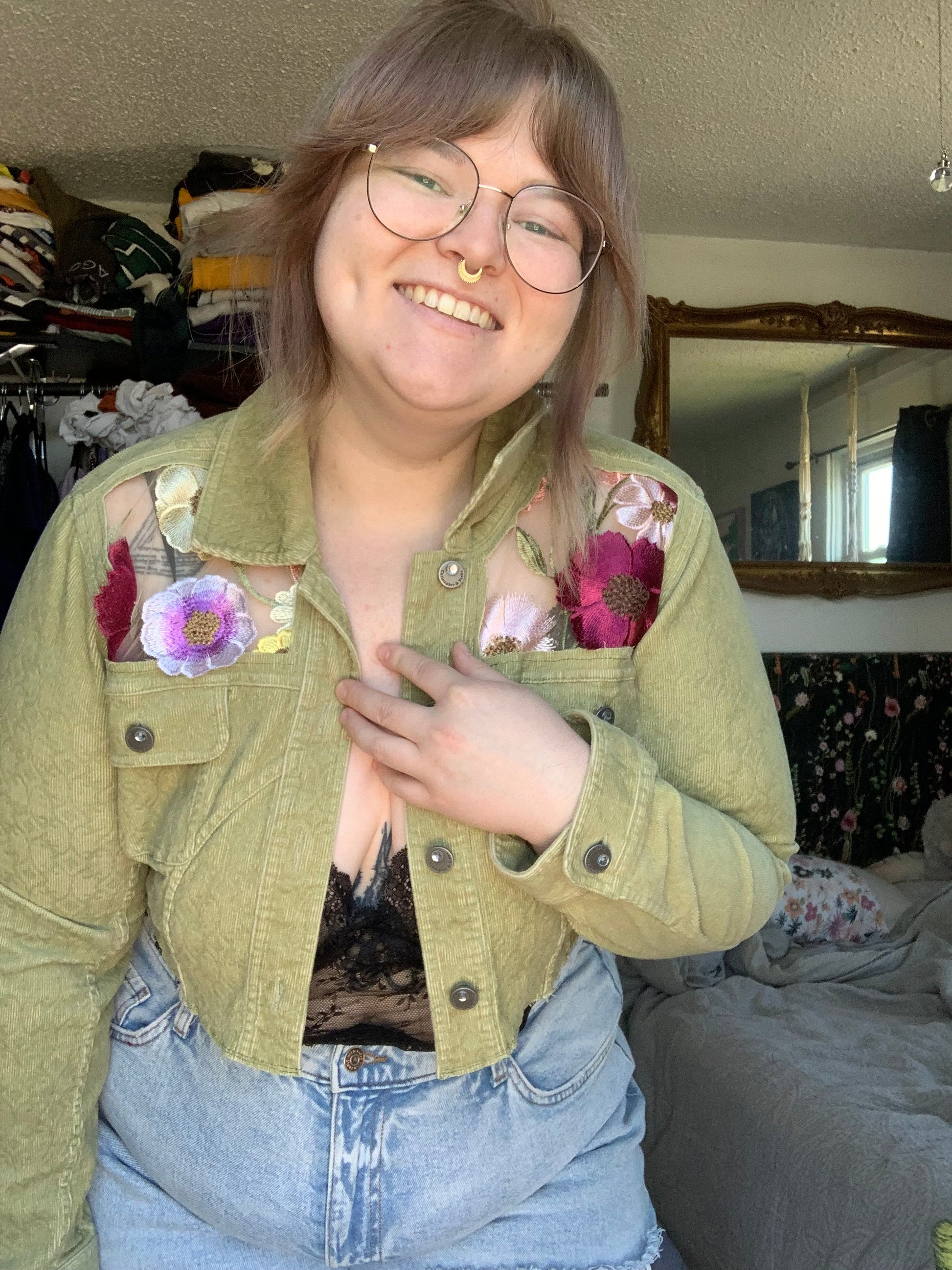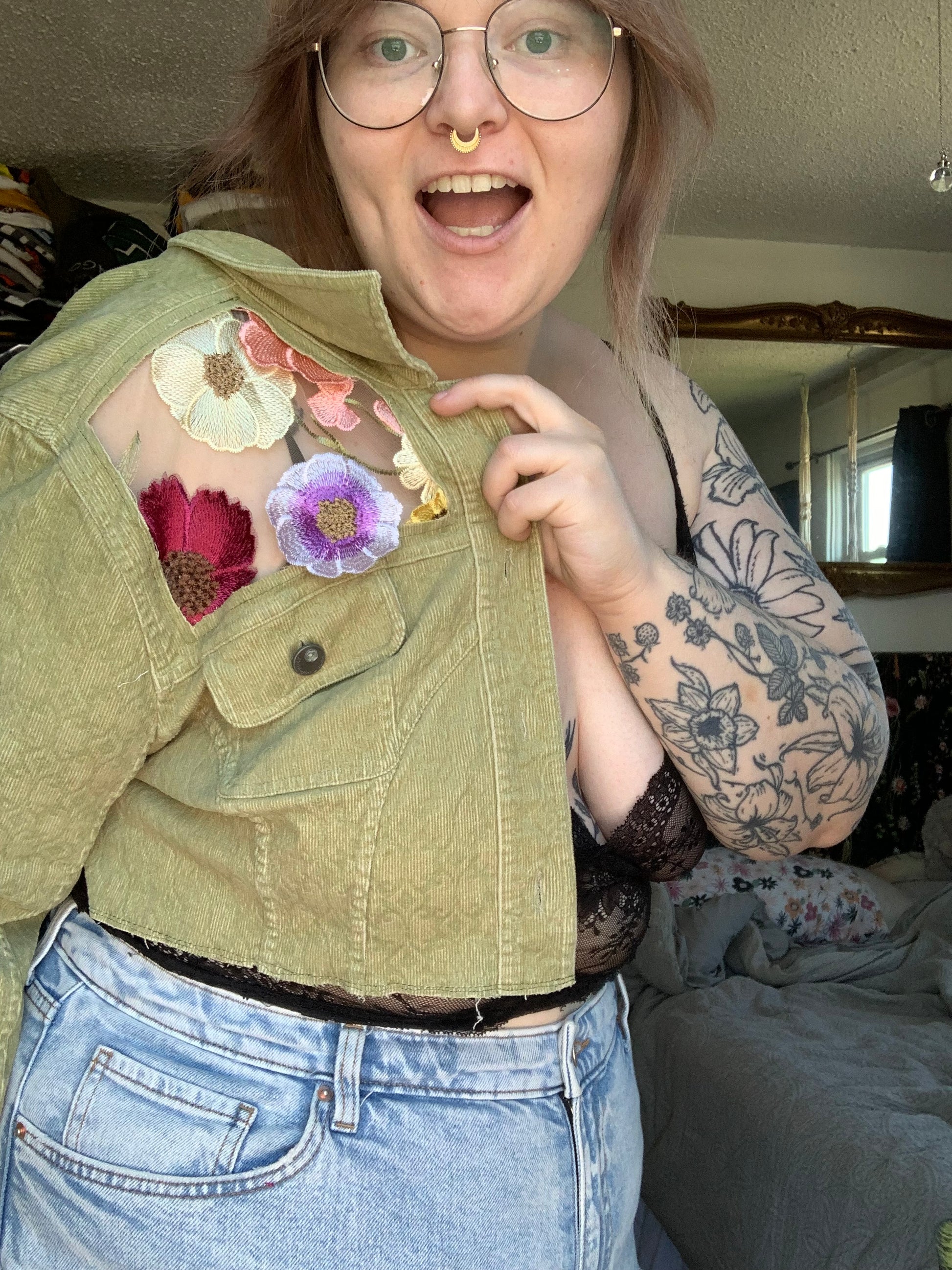 Cropped Green Denim Appliqué Wildflowers [XL]